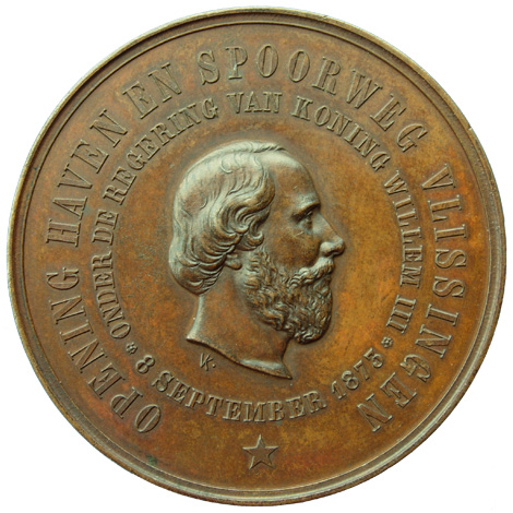 buitencirkel: * OPENING HAVEN EN SPOORWEG VLISSINGEN binnencirkel: ONDER DE REGERING VAN KONING WILLEM III * 8 SEPTEMBER 1973 *